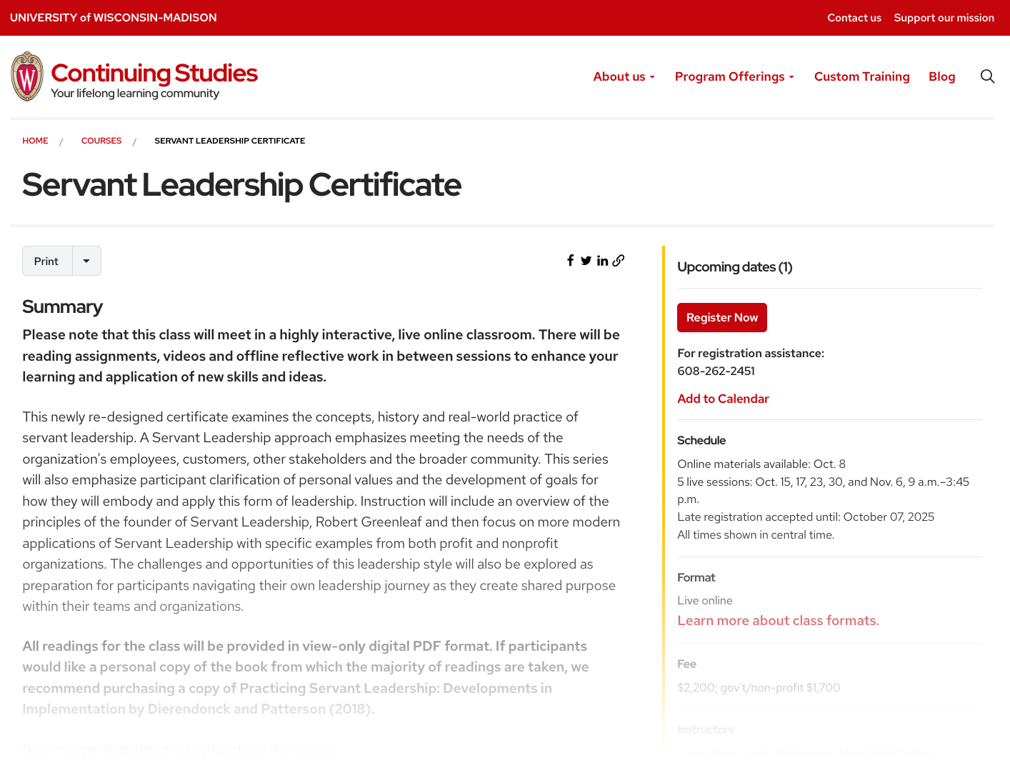 This newly re-designed certificate at Continuing Studies at UW-Madison examines the concepts, history, and real-world practice of servant leadership. Examine the core aspects of servant leadership and incorporate those learnings into your professional life. Designed for formal or informal leaders at any level in the organization and open to leaders in private business, health care, human services, nonprofit, or public sector. The program covers servant leadership foundations, leadership through self-awareness, connecting servant leadership to your world, and bringing servant leadership to life.